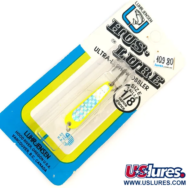 Mit einem Gewicht von 1/8oz (4g) ist dieser ultraleichte Hus-Lure ein Beweis für die klassische amerikanische Fertigung aus der Anlage von Luhr Jensen in Hood River, Oregon. Der 1 1/2" (4cm) lange Blinker besticht durch sein Farbschema in Silver und Chartreuse, das durch ein prismatisches Schachbrettmuster auf dem Mitteleinsatz zusätzlich aufgewertet wird. Auf der Originalverpackung als „Wobbler“ klassifiziert, ist seine Bauweise auf das ultraleichte Spinnfischen oder Schleppfischen ausgelegt. Ein technisches Hauptmerkmal dieses Modells 10980 ist das UV-aktive fluoreszierende Finish; unter ultraviolettem Licht leuchten die Chartreuse-Ränder intensiv auf, um die Sichtbarkeit bei schlechten Lichtverhältnissen oder in trübem Wasser zu gewährleisten. Dieses Exemplar ist unbenutzt und befindet sich in der originalen Vintage-Einzelhandelsverpackung. Zur Ausstattung gehören ein werksseitig montierter Drillingshaken und ein robuster Sprengring, während der Metallkörper selbst auf der Rückseite mit der Prägung „Made in USA“ versehen ist.