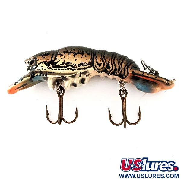 Ein detailliertes Flusskrebs-Dekor mit goldbraunen Tönen und schwarzer Marmorierung bedeckt den Körper dieses Köders und ahmt natürliche Beute realistisch nach. Mit einem Gewicht von 1/4 Unze (7 g) ist dieses schwimmende Modell zum Werfen und Twitchen konzipiert und erreicht Tiefen von ca. 1,5 m. Sammler suchen oft nach dem Produktcode 11643, der für die Qualität der US-Produktion von Luhr Jensen steht. Dieses 7 cm (2 3/4") lange Exemplar befindet sich in einem 5/5-Zustand und weist deutliche orangefarbene Akzente am Schwanz und an der vorderen Tauchschaufel auf. Es ist ein geräuschvoller, langsam aufsteigender Köder, der darauf ausgelegt ist, Bisse von Hechten und Barschen zu provozieren. Die Hardware besteht aus zwei originalen, bronzefarbenen Drillingshaken. Durch die Platzierung der Schnuröse an der Schwanzflosse stellten die Designer sicher, dass sich der Köder rückwärts durch die Wassersäule bewegt, genau wie ein panischer Flusskrebs.
