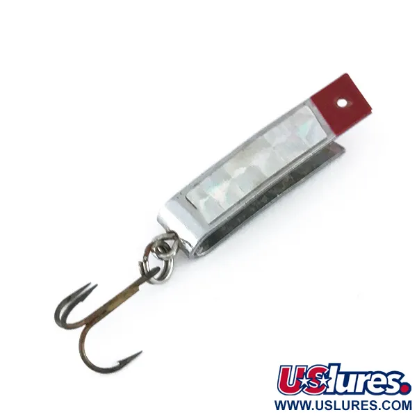 Mit einem geringen Gewicht von 2,3 g (3/32 oz) verfügt der Super-Duper 501 über ein poliertes Nickel-Finish, das in der gesamten Wassersäule für Lichtreflexe sorgt. Dieses spezifische Exemplar mit der Artikelnummer 8018 zeigt den klassischen U-förmigen Metallkörper, den Luhr Jensen in den USA gefertigt hat. Eine Seite des 3 cm (1 1/4") langen Rahmens ist mit einer quadratisch gemusterten Prismenfolie versehen, die einen holografischen Kontrast zum Metall bildet. Eine tiefrote Spitze an der Öse dient als traditioneller Bisspunkt, wie er oft bei diesen Vintage-Modellen zu finden ist. Die Rückseite weist eine saubere, polierte Metalloberfläche auf, in die das Markenlogo deutlich in das Nickel eingestempelt ist. Die gesamte Originalausstattung, einschließlich Sprengring und Drilling, ist gut erhalten und rechtfertigt eine Zustandsbewertung von 5/5. Ein bronzierter Drilling ist am hinteren Bogen des einzigartigen Profils befestigt.