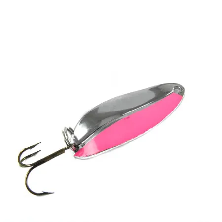 Mit einer Länge von 5 cm (2") verkörpert dieser Köder die klassische amerikanische Metallbaukunst von TODDCO Main Liner, identifiziert unter dem Produktcode 0392. Der Blinker verfügt über ein hochglanzpoliertes Nickel-Finish, das durch auffällige, leuchtend pinkfarbene Streifen auf der Außenseite akzentuiert wird – eine Farbkombination, die für optimale Sichtbarkeit bei verschiedenen Wasserverhältnissen entwickelt wurde. Mit einem Gewicht von 11 g (2/5 oz) wird sein massives Profil durch einen hochbelastbaren Sprengring und einen scharfen Drillingshaken ergänzt, was die funktionale Designphilosophie des Herstellers unterstreicht. Dieser spezielle Köder aus den USA befindet sich in einem Zustand von 5/5 und weist über seine gesamte Tropfenform eine saubere, glänzende Oberfläche auf. Der Kontrast zwischen dem reflektierenden silberfarbenen Metall und der gesättigten pinken Lackierung bleibt scharf und präzise definiert.