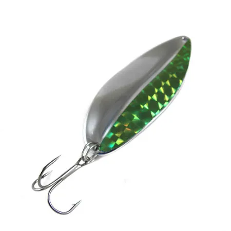 Mit einer Länge von 6 cm (2 1/4") verkörpert dieser Toddco Main liner das klassische Design amerikanischer Blinker. Bei einem Gewicht von 21 g (3/4 oz) basiert die Konstruktion des Köders auf einem tropfenförmigen Metallkörper mit einem markanten Längssteg. Das Finish dieses Modells mit der Artikelnummer 0823 ist in Nickel und Fluorescent Green gehalten. Während eine Seite in hochglanzpoliertem Nickel glänzt, ist die gegenüberliegende Seite mit einer prismatischen holografischen Folie in leuchtendem Grün versehen, die das Licht aus verschiedenen Winkeln reflektiert. Zur Ausstattung gehört ein scharfer Drilling, der durch einen robusten Sprengring am Heck gesichert ist. Mit einem Zustand von 5/5 sind die Metalloberflächen und die Klebekraft der Holografiefolie exzellent erhalten und weisen keine Altersspuren auf. Dieses nicht mehr hergestellte Modell steht für die Handwerkskunst der Marke Toddco aus der Zeit vor ihrer Schließung.