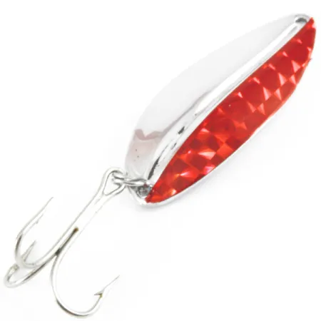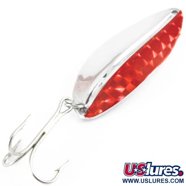 Mit einem Gewicht von 12,5 g (2/5 oz) zeigt dieser amerikanische Vintage-Blinker die Handwerkskunst von TODDCO, einem Hersteller, der seine Produktion in den USA um 1980 einstellte. Ein leuchtend rotes Inlay mit Diamantmuster bildet einen scharfen visuellen Kontrast zum hochglanzpolierten Nickelkörper, der eine Länge von 5,5 cm (2 1/4") aufweist. Dieser Main liner, identifiziert durch den Produktcode 3671, verfügt über eine klassische Tropfen-Silhouette mit einer glatten, konkaven Rückseite und einem einzelnen Befestigungsöhr am schmalen Ende. Zur Ausstattung gehört ein silberfarbener Drilling, der mit einem Sprengring gesichert ist. Dieses Exemplar befindet sich im Zustand 5/5, mit einem gut erhaltenen Metallfinish und fest sitzender prismatischer Rot-Folie.