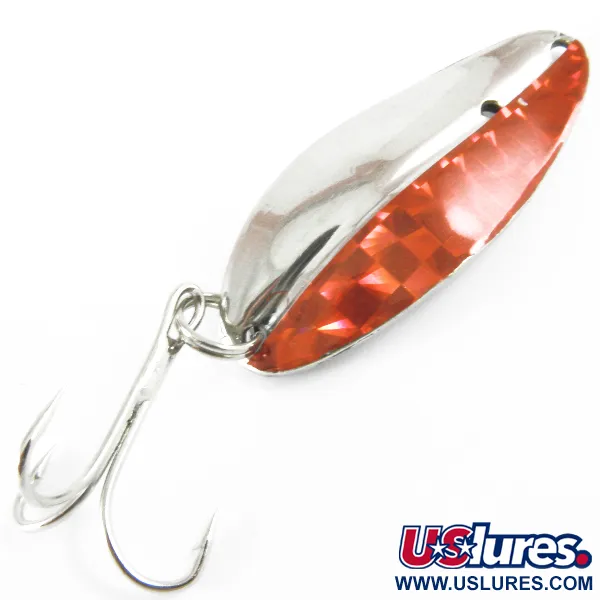 Mit einer Länge von 5 cm (2") hat der TODDCO Main liner ein kompaktes Profil. Dieser klassische US-Blinker wurde bis 1980 hergestellt. Mit einem Gewicht von 11 g (2/5 oz) verfügt der Blinker über ein markantes Längs-Split-Finish auf der konvexen Seite, bei dem poliertes Nickel auf einen leuchtend roten Hologramm-Aufkleber trifft. Das Schachbrettmuster der Folie sorgt für eine geometrische Textur, die im Kontrast zum glatten Metall der anderen Hälfte und der vollständig vernickelten konkaven Seite steht. Unter der Artikelnummer 3684 gelistet, befindet sich das Exemplar in einem 5/5-Zustand mit einer sauberen, reflektierenden Oberfläche auf allen Seiten. Die Montage besteht aus einem klassischen Drilling am breiteren Ende, während die verjüngte Nase zwei separate Bohrungen für verschiedene Montageoptionen aufweist.