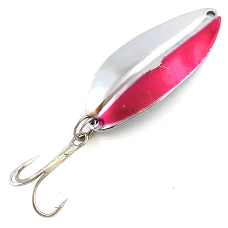 Das markante Gewicht von 2/5 oz (12,5 g) verleiht dem Main liner von TODDCO die nötige Masse für weite Würfe und zum Schleppen. Dieses spezielle Exemplar mit der Artikelnummer 5244 besticht durch ein klassisches amerikanisches Design eines Herstellers, der diese Köder bis 1980 in den USA produzierte. Mit einer Länge von 2 1/4" (5,5 cm) weist der Blinker ein auffälliges Nickel / Rot-Farbschema auf, bei dem eine Seite zwischen glänzend poliertem Nickel und einem leuchtenden, rot-pinkfarbenen, transluzenten Streifen geteilt ist. Die Rückseite behält ein sauberes, gleichmäßiges Nickel-Finish mit einem markanten Mittelsteg, der dem Metallkörper Stabilität verleiht. Die Montage besteht aus einem scharfen Drillingshaken, der über einen Sprengring am Ende befestigt ist. Der Köder befindet sich in einem 5/5-Zustand und hat seinen ursprünglichen Metallglanz und die Lackqualität vollständig bewahrt.