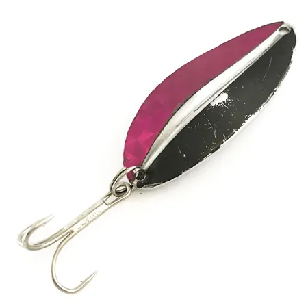 Mit einer Länge von exakt 5,5 cm (2 1/4") ist dieser Toddco Main liner ein klassisches Stück amerikanischer Angelgeschichte, das bis 1980 in den USA hergestellt wurde. Mit einem Gewicht von 12,5 g (2/5 oz) verfügt dieser Blinker über einen markanten Mittelgrat, der die Vorderseite in zwei unterschiedliche optische Hälften unterteilt: eine Seite mit tiefmagentafarbener Prismenfolie und eine Seite in massivem Schwarz. Die Rückseite besteht aus poliertem Nickel und bietet eine stark reflektierende Oberfläche als Ergänzung zur dunkleren Vorderseite. Dieses Exemplar mit der Artikelnummer 6461 befindet sich im Zustand 4/5 und bewahrt einen hellen Glanz auf den Metalloberflächen mit nur geringfügigen Altersspuren an den lackierten Stellen. Die Originalausstattung umfasst einen stabilen Drillingshaken, der über einen Edelstahl-Sprengring an der Basis des tropfenförmigen Körpers befestigt ist.