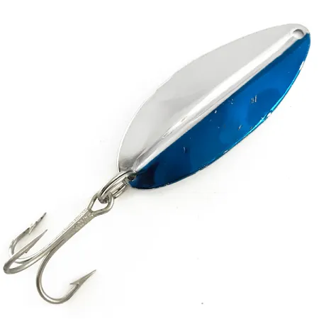 Nickel- und blau-lackierte Oberflächen teilen die Vorderseite dieses 12,5 g (2/5 oz) schweren Blinkers, wodurch ein kontrastreiches Design entsteht, das bis zum Produktionsstopp 1980 ein Standardmodell von TODDCO war. Mit einer Länge von 5,5 cm (2 1/4 Zoll) besitzt der Main liner einen markanten Längsgrat, der dem Metallkörper strukturelle Steifigkeit verleiht. Dieser in den USA hergestellte Köder mit dem Produktcode 6493 wurde für vielseitige Wurfanwendungen konzipiert. Die Rückseite ist in sauberem, poliertem Nickel gehalten, während die Vorderseite einen leuchtend blauen Akzentstreifen auf einer Hälfte des Blattes zeigt. Die Montage umfasst einen robusten Drillingshaken, der über einen Sprengring am hinteren Ende befestigt ist. Dieses Exemplar befindet sich in einem 4/5-Zustand und weist eine gut erhaltene Beschichtung mit nur geringfügigen, altersbedingten Oberflächenspuren auf. Eine einfache Schnuröse an der Spitze vervollständigt die effektive Geometrie dieses Vintage-Fundstücks.