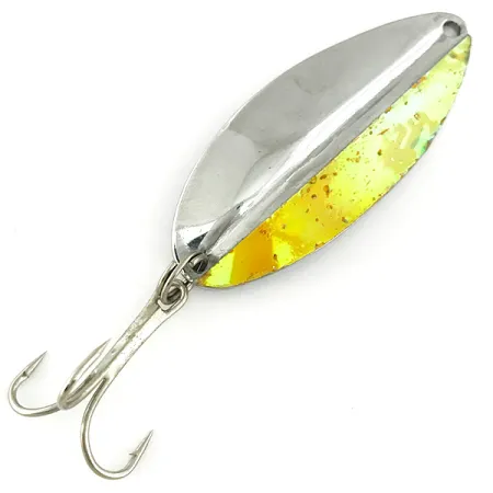 Dieser 5,5 cm (2 1/4") lange Blinker ist längs in zwei verschiedene Hälften unterteilt und präsentiert ein klassisches Nickel / Nickel / Orange Farbschema. Eine Seite besticht durch ein hochglanzpoliertes Nickel-Finish für maximale Lichtreflexion, während die andere mit einem lebhaften orange-gelben Schuppenmuster versehen ist, das unter UV-Licht stark reagiert. Der Main liner wurde bis 1980 vom amerikanischen Unternehmen TODDCO hergestellt und ist ein fester Bestandteil des US-Angeldesigns der Mitte des Jahrhunderts. Dieses Exemplar mit der Artikelnummer 6877 befindet sich in einem 5/5-Zustand mit bemerkenswert sauberen Oberflächen und perfekt erhaltenen Kleinteilen. Der Köder ist mit einem klassischen Drillingshaken und einem stabilen Sprengring ausgestattet und wiegt für effektive Würfe 12,5 g (2/5 oz).
