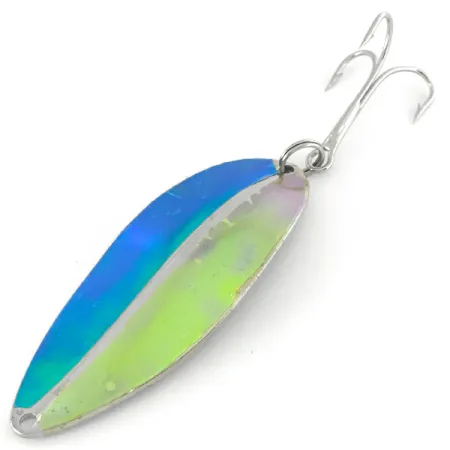 Dieser in den USA hergestellte Blinker mit einem Gewicht von 3/4 oz (21 g) zeichnet sich durch einen markanten, kielartigen Rücken aus, der über die gesamte Länge des 2 1/4" (6 cm) langen Körpers verläuft. Die von TODDCO in den Vereinigten Staaten bis zum Produktionsende 1980 gefertigte Main liner ist ein Klassiker für Sammler von Metallködern aus der Mitte des letzten Jahrhunderts. Das Green / Nickel-Finish dieses Exemplars mit der Artikelnummer 7020 zeigt auf der Vorderseite einen brillanten, irisierenden Glanz, der von Tiefblau zu hellem Limettengrün übergeht. Auf der Rückseite glänzt der Köder mit poliertem Nickel, um maximale Lockwirkung durch Lichtreflexion zu erzielen. Mit einer Bewertung von 5/5 behält dieses Stück seinen ursprünglichen Werksglanz und ist mit einem stabilen, silberfarbenen Drillingshaken an einem robusten Sprengring ausgestattet.