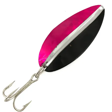 Ein Gewicht von 21 g (3/4 oz) verleiht dem Toddco Main Liner eine beträchtliche Dichte für das Schleppangeln im Tiefwasser oder weite Würfe. Dieser 6,5 cm (2 1/2") lange Blinker in Weidenblattform weist eine scharfe, längs verlaufende Farbtrennung auf der Vorderseite auf, mit einer dunkelroten Metallic-Seite gegenüber einer tiefschwarzen Hälfte. Eine polierte Nickelnaht verläuft in der Mitte und spiegelt das komplette Nickel-Finish auf der Rückseite des Metalls wider. Dieser in den USA hergestellte Köder mit der Artikelnummer 7337 stammt aus einer klassischen Ära der Toddco-Produktion, die 1980 endete. Die Montage besteht aus einem scharfen Drilling, der durch einen Sprengring gesichert ist, und der Gesamtzustand wird mit 5/5 bewertet. Die gestanzte Öse an der Oberseite ist sauber gebohrt für direkte Schnurverbindungen oder Snaps.