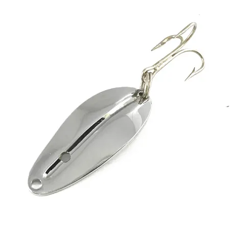 Eine Vernickelung kennzeichnet das Äußere dieses TODDCO Main liner, ein Design, das bis zur Einstellung der Produktion um 1980 ein fester Bestandteil im amerikanischen Katalog des Herstellers blieb. Mit einem Gewicht von 1/4 oz (7 g) misst der Metallkörper kompakte 1 1/2" (4 cm) in der Länge und weist einen markanten Mittelgrat auf, der zur Schnuröse verläuft. Dieses spezielle Exemplar mit dem Produktcode 7634 befindet sich in unbenutztem Zustand und hat seinen ursprünglichen, spiegelnden Glanz bewahrt. Der gestanzte Blinker verfügt über eine einzelne kreisförmige Perforation am oberen Ende und ist mit einem scharfen, silberfarbenen Drilling ausgestattet. Die Bauweise spiegelt die geradlinigen Wurfköder-Designs wider, die in der US-Angelszene in der Mitte des 20. Jahrhunderts typisch waren.