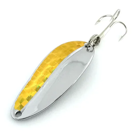 Eine goldene Hologrammfolie bedeckt genau die Hälfte des vernickelten Körpers dieses 2" (5 cm) langen TODDCO Main Liner. Mit einem Gewicht von 11 g (2/5 oz) basiert dieser Köder auf einem soliden Metallkörper mit einem ausgeprägten Längskiel auf der Rückseite, der die Ausrichtung stabilisiert. Dieses Exemplar mit dem Produktcode 8651 ist unbenutzt und weist den ursprünglichen Glanz sowohl auf dem polierten Nickel als auch auf der strukturierten Goldfolie auf. Das bis 1980 in den USA hergestellte Design von TODDCO verwendet einen einzelnen Drillingshaken, der über einen robusten Sprengring am Heck befestigt ist. Der Kontrast zwischen dem glatten Silberfinish und den geometrischen Mustern der goldenen Hologrammseite sorgt für ein zweifarbiges visuelles Profil, das typisch für US-Angelsportartikel des späten 20. Jahrhunderts ist. Eine einzelne, sauber gebohrte Öffnung an der Nase dient als Hauptbefestigungspunkt für das Wurfangeln oder Schleppen.