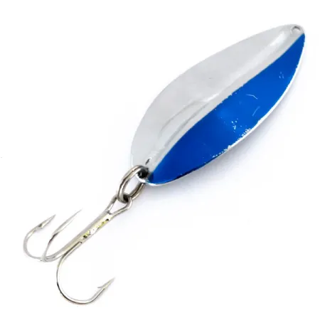 Mittig geteilt, bietet die Vorderseite dieses Blinkers einen kontrastreichen Effekt zwischen der reflektierenden Vernickelung und einer tiefblauen Emaille. Bis 1980 in den USA hergestellt, weist der TODDCO Main liner, Artikelnummer 9981, ein klassisches blattförmiges Profil auf, das sich ideal für verschiedene Wurf- und Schleppangeltechniken eignet. Mit 21 g (3/4 oz) bietet der Metallkörper eine beachtliche Dichte für seinen 6,5 cm (2 1/2") langen Rahmen, ergänzt durch einen großen Drilling, der an einem robusten Sprengring befestigt ist. Während die Vorderseite zweifarbig gestaltet ist, ist die Rückseite über die gesamte Länge in gleichmäßig poliertem Nickel gehalten. Dieses spezifische Exemplar befindet sich in einem hervorragenden Zustand, was eine Bewertung von 5/5 rechtfertigt. Eine einzelne Öse zur Schnurbefestigung befindet sich an der verjüngten Nase des 6,5 cm (2 1/2") langen Blattes.