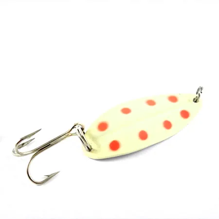 Mit einem Gewicht von 12,5 g (2/5 oz) verfügt der Metallkörper über eine charakteristische Längsrille auf dem Rücken – ein technisches Detail, das typisch für den heute nicht mehr existierenden amerikanischen Hersteller TODDCO ist. Dieses Main liner Glow Modell mit dem Produktcode 2839 hat eine Länge von 5,5 cm (2 1/4") und besitzt eine lumineszierende weiße Vorderseite mit acht markanten roten Punkten. Die Rückseite ist hochglanzpoliert vernickelt, was dem im Dunkeln leuchtenden Design ein reflektierendes Element verleiht. Die Hardware ist in hervorragendem Zustand und umfasst den originalen Drillingshaken sowie den Sprengring. Mit einer Bewertung von 5/5 zeigen die Lackierung und die Beschichtung, wie sorgfältig dieser Vintage-Blinker über die Jahre behandelt wurde. Seine selbstleuchtenden Eigenschaften wurden speziell für die Sichtbarkeit bei schlechten Lichtverhältnissen oder in tieferen Wasserschichten entwickelt.