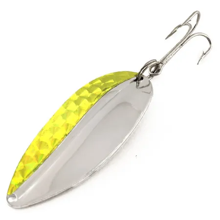 Mit einer Länge von 6,5 cm (2 1/2") verfügt dieser Blinker über ein geteiltes Oberflächendesign, das poliertes Nickel mit einem strukturierten, holographischen gelben Tape kombiniert. Der 21 g (3/4 oz) schwere TODDCO Main liner UV wurde für beachtliche Wurfweiten oder das Erreichen spezifischer Tiefen beim Schleppfischen entwickelt. Sein Farbschema „Nickel / Green“ bietet eine doppelte optische Reizwirkung: Während eine Seite das Licht auf dem polierten Metall reflektiert, reagiert die fluoreszierende Tape-Seite auf UV-Licht. Unter schlechten Lichtverhältnissen gibt dieses spezielle Finish ein lebhaftes grünes Leuchten ab, ein technisches Merkmal des Modells 11434. Dieses in den USA hergestellte Exemplar befindet sich im Zustand 5/5 und behält seinen ursprünglichen Werksglanz sowie die klaren holographischen Schuppenmuster. Ein scharfer Standard-Drilling ist über einen hochbelastbaren Sprengring am Schwanzende befestigt.
