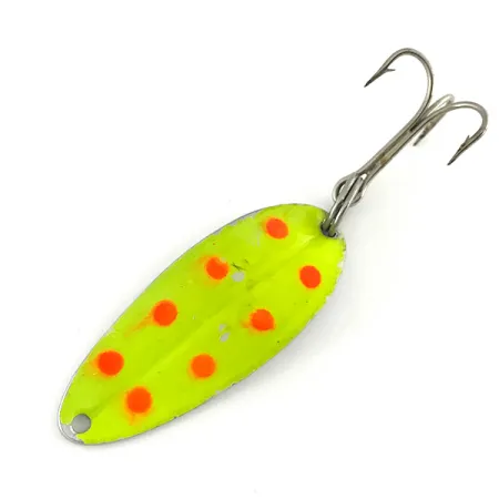 Gelbe Lackierung und leuchtend rote Punkte prägen die Vorderseite dieses TODDCO Main liner UV, ein klassischer Blinker, der vor 1980 in den USA hergestellt wurde. Mit einem Gewicht von 11 g verfügt der Köder über eine vernickelte Rückseite und einen stabilen Drilling, der mit einem Sprengring befestigt ist. Dieser spezifische Main liner mit dem Produktcode 7555 zeigt die frühe Verwendung von fluoreszierenden Oberflächen im Vintage-Angeldesign. Bei UV-Licht verwandelt sich die gelbe Basis in ein helles Neongrün, während die roten Punkte ein kräftiges, kontrastreiches Leuchten für Sichtbarkeit in tieferen Wasserschichten beibehalten. Mit einer Länge von 5 cm befindet sich das Exemplar in einem 5/5-Zustand, wobei das Originalfinish lebendig und die Metallkomponenten glänzend geblieben sind. Die verjüngte Löffelform und die schwere Nickelbasis deuten auf ein Design hin, das für das Wurfangeln oder Vertikaljiggen geeignet ist.