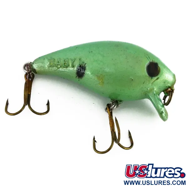 Ein Gewicht von 1/4 oz (7 g) verleiht diesem Flachläufer die nötige Masse für präzise Würfe in dichtes Cover. Mit einer Länge von 2 1/4" (6 cm) besticht der Köder durch ein perlmuttartiges Green / Black Finish und die markante "BABY"-Reliefprägung an der Flanke. Mann's Bait hat dieses Modell so konstruiert, dass es in der obersten Wasserschicht bleibt und eine maximale Tiefe von nur 0,3 m (1 ft) erreicht. Das Design umfasst ein einzigartiges Augenmuster mit feinen radialen Linien und einen einzelnen schwarzen Seitenpunkt, typisch für klassische Produktionsserien aus den USA. Alle Original-Komponenten sind vorhanden, einschließlich zweier stabiler Drillinge und eines Sprengrings an der Schnurfassung, was diesem Artikel eine Zustandsbewertung von 5/5 einbringt. Die Artikelnummer 9711 ist mit einer kurzen, steilen Tauchschaufel gefertigt, die das Abtauchen begrenzt und gleichzeitig den Auftrieb eines Schwimmköders bewahrt.