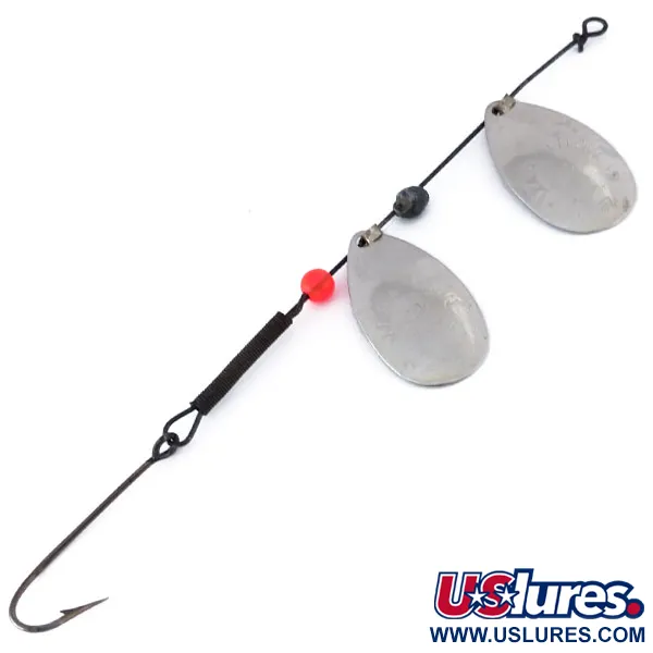 Eine hochwertige Vernickelung bedeckt die Tandem-Blätter dieses 12,0 cm (4 3/4") langen Spinner-Rigs und sorgt für einen hellen Lockreiz unter verschiedenen Wasserbedingungen. Mit einem Gewicht von 3,4 g (1/8 oz) ist der Köder auf einer dunklen Drahtachse aufgebaut und verfügt über eine einzelne rote Perle, die als Bisspunkt zwischen dem unteren Blatt und dem Haken dient. Die Tandem-Konfiguration nutzt zwei tropfenförmige Blätter, um die Oberfläche zu maximieren und gleichzeitig ein schlankes Profil zum Werfen oder Schleppen beizubehalten. Ein Einzelhaken mit scharfer Spitze ist am Heck befestigt und für zusätzliche Stabilität mit einer schwarzen Hülse verstärkt. Dieser Köder der Marke Marathon mit der Artikelnummer 10143 wurde in den USA mit Fokus auf Langlebigkeit hergestellt. Der Zustand wird mit 4/5 bewertet, was ein gut erhaltenes Metallfinish und saubere Hardware zeigt. Eine einfache Drahtschlaufe an der Vorderseite ermöglicht einen direkten Knoten oder die Verwendung eines kleinen Snaps.