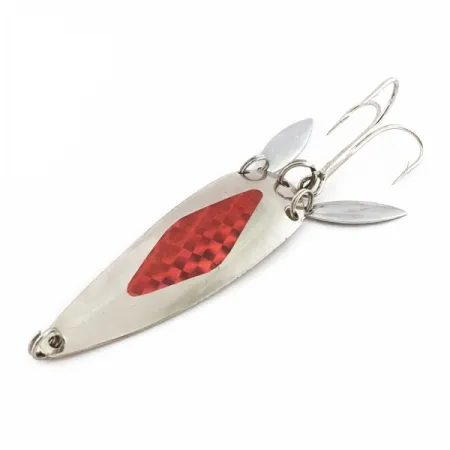 Zwei kleine silberne Spinnerblätter folgen dem verchromten Körper und sorgen für zusätzlichen Reflexionen und visuelle Bewegung direkt in der Bisszone. Die reflektierende Oberfläche verfügt über einen texturierten roten „Diamantschuppen“-Einsatz in der Mitte der konvexen Seite für hohe Kontrastwirkung unter Wasser. Mit einer Länge von 3" (7,5 cm) und einem Gewicht von 17 g (3/5 oz) ist die Gewichtsverteilung ideal für weite Würfe oder konstantes Schleppfischen. Dieses Design wurde von der Marathon Bait Company zwischen 1929 und 1979 hergestellt, um das Profil eines Blinkers mit den zusätzlichen Vibrationen von Hilfsblättern zu kombinieren. Dieses Exemplar befindet sich im Zustand 5/5, wobei das reflektierende Finish und der rote Schuppenaufkleber sauber und unbeschädigt sind. Artikelnummer 24602.