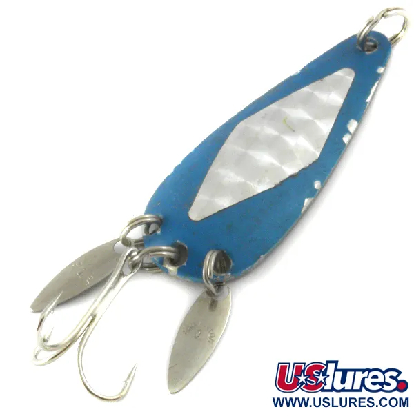 Das Finish in Nickel und Blau prägt das Erscheinungsbild dieses 6 cm (2 1/4") langen Wurfgewichts-Blinkers der Marathon Bait Company. Marathon war zwischen 1929 und 1979 in Wisconsin ansässig und produzierte innovative Designs wie dieses, das mit zwei kleinen, beweglichen "Sonic Blades" am Heck ausgestattet ist. Diese länglichen Nickellamellen sind an Sprengringen montiert, um die Illusion eines Fischschwanzes zu erzeugen und gleichzeitig den scharfen Drillingshaken teilweise zu verbergen. Mit einem Gewicht von 12 g (2/5 oz) ist der Köder auf der Rückseite mit dem Namen des Herstellers geprägt, was seine Herkunft aus den USA kennzeichnet. Die Vorderseite des Blinkers weist ein strukturiertes Rautenmuster-Inlay auf, das im Kontrast zur lackierten blauen Umrandung steht. Unter der Artikelnummer 4130 gelistet, befindet sich dieses Exemplar in einem 4/5-Zustand und zeigt gut erhaltene Hardware sowie kräftige Farben, die seine Geschichte als Klassiker des Angelns aus der Mitte des Jahrhunderts widerspiegeln. Ein Sprengring an der Nase bietet einen sicheren Befestigungspunkt für den Angler.