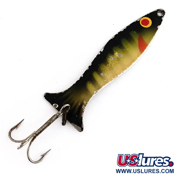 Mit einer Länge von 3 1/4" (8 cm) weist dieser Blinker das ikonische Profil auf, das die fünfzigjährige Produktion der Marathon Bait Company in Wausau, Wisconsin, prägte. Die polierte Nickel-Rückseite ist mit dem Namen „MARATHON MUDMINO“ geprägt und bildet einen scharfen Kontrast zum lackierten Barschmuster auf der Vorderseite. Dieses spezifische Dekor nutzt einen dunkelgrünen Rücken mit vertikalen schwarzen Streifen und einen leuchtend roten Kiemenpunkt, um lokale Beutefische zu imitieren. Mit einem Gewicht von 12 g (2/5 oz) verfügt der Köder über ein verbreitertes Schwanzdesign, in dem ein einzelner Drilling montiert ist. Unter dem Produktcode 9938 geführt, weisen die lackierten Oberflächen leichte Gebrauchsspuren am Rand auf, was zu einer Zustandsbewertung von 4/5 führt.