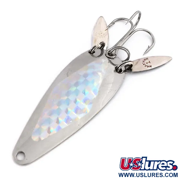 Mit einem Gewicht von 12 g (2/5 oz) verfügt dieser 6 cm (2 1/4") lange vernickelte Blinker über eine auffällige holografische Folie im Rautenmuster auf der konvexen Seite. Die Marathon Bait Company, ein von 1929 bis 1979 aktiver Hersteller aus Wisconsin, entwarf dieses spezielle Modell (Produktcode 10276) mit zwei am hinteren Sprengring befestigten „Sonic Blades“. Diese schmalen Miniblättchen sollen für zusätzliche Lichtreflexe und subtile Bewegungen um den Drillingshaken sorgen, wobei sie die Endmontage effektiv kaschieren und ein sekundäres visuelles Element hinzufügen. Die Rückseite des Sammlerstücks ist deutlich mit dem Namen Marathon gestempelt und weist ein hochglänzendes Finish auf. Dieser Köder befindet sich in einem Zustand von 5/5 und behält seinen ursprünglichen Glanz auf den Metalloberflächen und dem facettierten Aufkleber bei. Die kleinen Zusatzblättchen sind mit einer Nummer 1 gestempelt, was ihre Größe im Verhältnis zum Hauptkörper des Blinkers angibt.