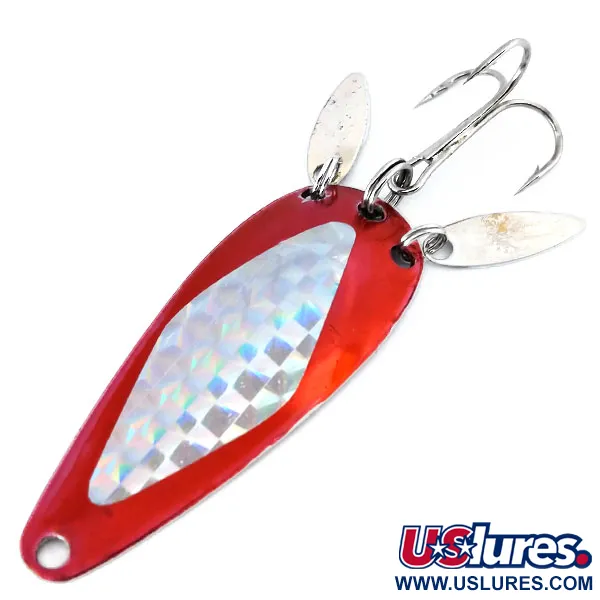 Dieser Marathon Löffelblinker besticht durch sein tropfenförmiges Profil, eine leuchtend rote Lackierung und einen reflektierenden Prismen-Einsatz. Mit einer Länge von 6 cm (2 1/4") und einem Gewicht von 12 g (2/5 oz) trägt dieser Köder das Erbe der Marathon Bait Company aus Wisconsin (1929–1979). Auf der polierten Nickel-Rückseite ist eine deutliche „MARATHON“-Prägung sichtbar. Dieses Modell mit der Artikelnummer 10363 ist mit zwei kleinen, silberfarbenen Weidenblatt-Spinnerblättern (Sonic Blades) am Heck ausgestattet. Diese Zusatzblätter sorgen beim Einholen für zusätzliche Lichtreflexe in der Nähe des Drillings. Die Vorderseite ist mit einer diamantgemusterten Hologramm-Folie versehen, die das volle Lichtspektrum gegen den tiefroten Lack reflektiert. Die gesamte Hardware, einschließlich der Sprengringe und des silbernen Drillings, ist in exzellentem Zustand (Bewertung 5/5). Der Kopf des Löffels verfügt über eine sauber gebohrte Öse zur direkten Befestigung oder für die Verwendung eines Snaps.