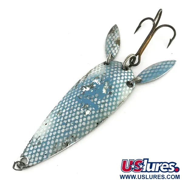 Ein lebhaftes blau-weißes Wabenmuster ziert die Vorderseite dieses 7,5 cm (3") langen Blinkers. Unter dem Produktcode 8429 gefertigt, verfügt die Konstruktion über zwei kleine, weidenblattförmige Spinnblätter, die mit Sprengringen im hinteren Bereich befestigt sind. Diese reflektierenden Blätter sorgen für zusätzliche optische Reize und dienen dazu, den bronzierten Drillingshaken zu kaschieren. Mit einem Gewicht von 17 g (3/5 oz) ist der Köder ein klassisches Design der Marathon Bait Company, die von 1929 bis 1979 in Wisconsin ansässig war. Die Rückseite besteht aus poliertem Nickel, auf dem „M-1“ und „NAVY“ leicht auf dem Metall zu erkennen sind. Im aktuellen Zustand 4/5 weist die Lackierung leichte Gebrauchsspuren auf, behält aber ihr charakteristisches strukturiertes Erscheinungsbild bei.