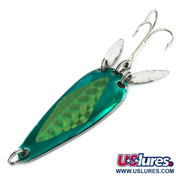 Zwei silberne „Sonic Blades“ in Weidenblattform sind am Heck dieses 6 cm (2 1/4") langen Blinkers montiert, ein charakteristisches Designmerkmal der Marathon Bait Company. Dieser 12 g (2/5 oz) schwere Köder mit der Artikelnummer 9023 besticht durch eine auffällige blaugrüne Vorderseite mit einem eingearbeiteten holografischen Streifen im Diamantmuster. Dieses spezielle Exemplar spiegelt das Erbe des in Wisconsin ansässigen Unternehmens wider, das von 1929 bis 1979 Angelgeräte herstellte. Die Rückseite ist mit einer glänzenden Nickelplattierung versehen, und der Gesamtzustand wird mit 5/5 bewertet. Die zusätzlichen Blättchen erzeugen ein flackerndes Aufblitzen, das die Bewegung des Schwanzes eines Beutefisches simuliert und gleichzeitig den Drilling verdeckt. Die Hardware ist stabil, wobei die originalen Sprengringe die Blättchen und den Haken am tropfenförmigen Körper sichern.