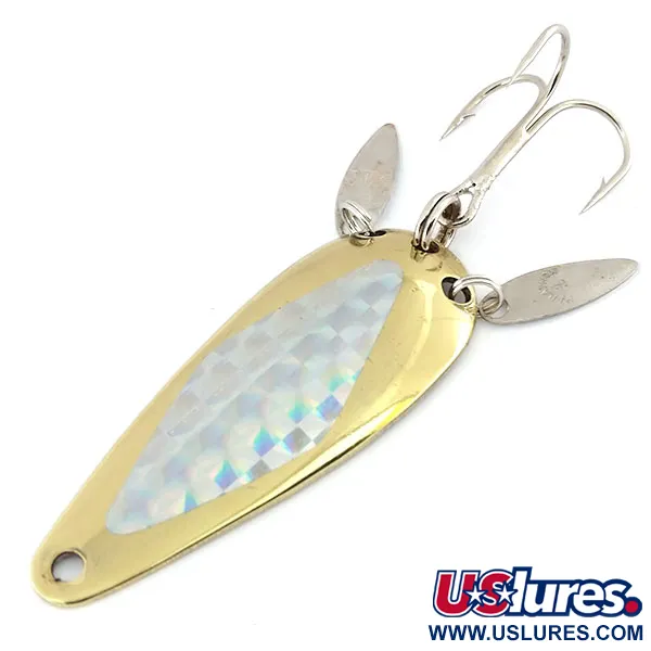 Dieser Blinker besticht durch seine klassische Tropfenform und einen goldfarbenen Körper, der auf der konvexen Seite mit einem lebendigen prismatischen Schuppenmuster versehen ist. Auf der konkaven Rückseite ist deutlich der Name „MARATHON“ eingeprägt, eine Marke der Marathon Bait Company, die zwischen 1929 und 1979 in Wisconsin Köder herstellte. Dieses spezifische Exemplar mit der Artikelnummer 9680 ist 6 cm (2 1/4") lang und wiegt 12 g (2/5 oz). Zwei kleine, vernickelte Sonic Blades (Schallplättchen) sind direkt über dem Drillingshaken angebracht, um zusätzliche Lichtreflexionen zu erzeugen und die Hakenmontage optisch zu tarnen. Dieser Köder befindet sich im Zustand 5/5 und weist ein sauberes Finish sowohl auf dem beschichteten Körper als auch auf den zusätzlichen Plättchen auf.