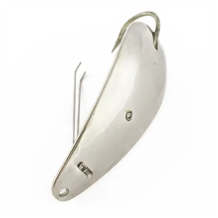Die Versilberung betont das schlanke Profil dieses 5,5 cm (2 1/4") langen Master Weedless Lotta Junior. Dieser in den USA hergestellte Köder besticht durch einen massiven Metallkörper mit einem integrierten Einzelhaken, der speziell für das Angeln in dichtem Bewuchs konzipiert wurde. Um Hänger zu vermeiden, ist an der Basis des Hakens ein doppelter Krautschutz aus Federstahldraht montiert, der nach oben zur Spitze verläuft. Dieses Exemplar mit dem Produktcode 24158 weist eine glänzende, hervorragend erhaltene Oberfläche auf, die dem Zustand 5/5 entspricht. An der Nase ermöglicht eine sauber gebohrte Öse die direkte Montage oder das Einhängen eines Wirbels. Das Gewicht von 12 g (2/5 oz) verleiht ihm eine beachtliche Masse für weite und präzise Würfe. Ein kleiner Niet und die eingestanzten Markierungen auf dem Körper belegen die Fertigungstechniken der Marke Master aus der Mitte des letzten Jahrhunderts.