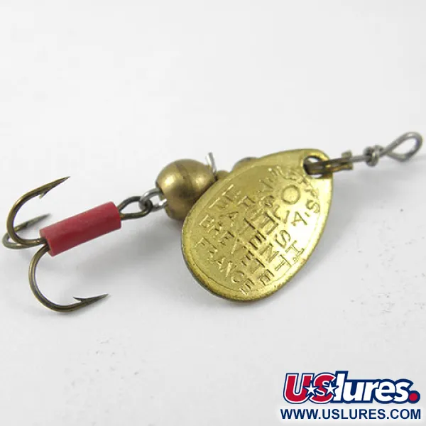 Auf dem Messingblatt sind deutlich die Markierungen „AGLIA“ und „BRITISH PATENT“ eingestempelt, was auf die geschichtsträchtige europäische Herkunft dieses Spinners der Größe 0 hinweist. Mit der Artikelnummer 1141 wiegt der Köder flinke 1/16 oz (2,2 g) und hat eine Gesamtlänge von 1 1/2" (4 cm). Dieses Exemplar verfügt über ein klassisches Messingfinish sowohl auf dem Blatt als auch auf den beschwerten Perlen, die die zentrale Drahtachse besetzen. Ein leuchtend roter Schlauch ist über den Schenkel des Drillings gezogen, eine Designentscheidung, die darauf abzielt, die Aufmerksamkeit des Fisches auf das geschäftliche Ende der Hardware zu lenken. Die Komponenten wurden in Frankreich hergestellt, wie die Stempel „BREVETE“ und „MADE IN FRANCE“ zeigen, obwohl die Endmontage in den USA stattfand. Mit einem Zustand von 5/5 bewertet, ist dieser Köder unbenutzt und befindet sich in makellosem Zustand, entweder für die Vitrine oder die ultraleichte Weste. Das Blatt ist über einen einfachen Messingreiter befestigt, der so konstruiert ist, dass er bei gleichmäßigem Einholen frei um die Achse rotiert.