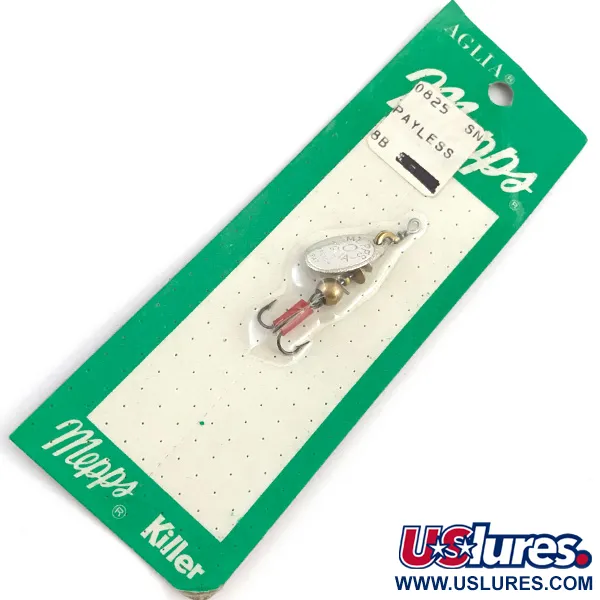 Die Versilberung der gehämmerten Palette sorgt bei diesem ultraleichten 2,5 g (3/32 oz) Spinner für maximale Sichtbarkeit. Mit einer Länge von exakt 4,5 cm (1 3/4") ist dieser Mepps Aglia 0 ein Paradebeispiel für das weltberühmte Design, das ursprünglich von Todd Sheldon in die USA gebracht wurde. Der Köder ist unbenutzt und wird in der originalen „Mepps Killer“-Verpackung inklusive eines zeitgenössischen „Payless“-Preisschilds geliefert. Ein leuchtend rotes Schlauchstück über dem Schenkel des Drillingshakens bildet einen starken Kontrast zu den Messing-Gewichtsperlen und den silbernen Komponenten. Dieses Exemplar mit dem Produktcode 4923 verfügt über die klassische Rückseite der Sheldons' Inc. Versandkarte, die Vintage-Bekleidung aus dem Hauptsitz in Antigo, Wisconsin, anbietet. Die Konstruktion basiert auf einem präzisen Konus-Rotationssystem, das die Palette frei um die Drahtachse rotieren lässt. Jede Komponente, vom Bügel bis zum Haken, befindet sich im Originalzustand.
