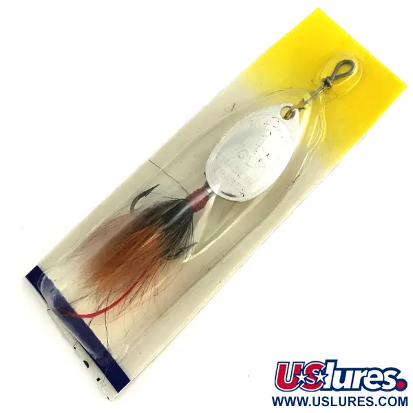 Ein versilbertes Blatt zeichnet diesen 3,5 g (1/8 oz) Spinner aus, der ein fester Bestandteil des Mepps-Sortiments ist. Dieses unter dem Produktcode 8678 geführte Modell Aglia 1 dressed hat eine Gesamtlänge von 6 cm (2 1/4"). Der Köder ist unbenutzt und originalverpackt, präsentiert auf der gelb-weißen Blisterkarte der Mepps Fishing Guide Ära aus Antigo, Wisconsin. Die Befederung besteht aus dunkelbraunen und schwarzen Fasern mit einem markanten roten Akzent an der Basis des Drillings. Das Blatt weist die traditionelle Prägung auf, eine Hommage an das französische Design von Andre Meulnart aus dem Jahr 1938, das später in die Vereinigten Staaten gebracht wurde. Gefertigt aus US-amerikanischen und ausländischen Komponenten, erfüllt er die hohen Hardware-Standards der Marke. Die Klarsichtverpackung ist intakt und schützt das reflektierende Silberfinish sowie die Struktur des handgebundenen Federdrillings.