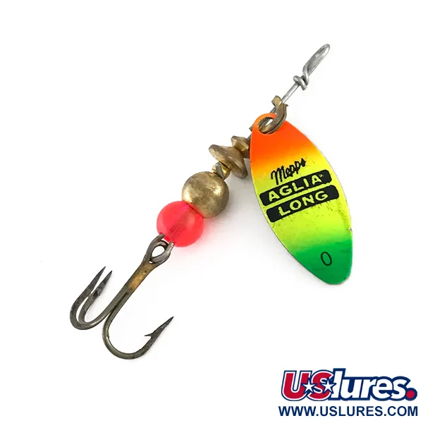 Mit einer Länge von genau 5 cm ist das schlanke Profil dieses Spinners der Größe 0 eine klassische Wahl für ultra-leichte Präsentationen. Das weidenblattförmige Spinnerblatt verfügt über ein lebhaftes, mehrfarbiges Dekor auf der Vorderseite, das von einem tiefen Orange in ein leuchtendes Limonengrün übergeht. Die Rückseite des Blattes ist in Messing gehalten und trägt die deutlich eingestempelte Herstellermarke, die den Ursprung in Frankreich belegt. Die Mittelachse ist mit Messinggewichten bestückt, darunter eine markante große Kugellperle und zwei kleinere strukturierte Scheiben, die das für präzise Würfe erforderliche Gewicht von 2,6 g liefern. Eine einzelne, gut sichtbare neonpinke Perle direkt über dem Drillingshaken dient als Reizpunkt für Forellen oder Barschartige. Während die Kernkomponenten des Artikels 8142 aus Frankreich stammen, erfolgte die Endmontage in den USA. Mit einer Bewertung von 5/5 weist dieses Exemplar gut erhaltene Hardware und Lackierung auf, wobei die schwarze Beschriftung auf der Blattvorderseite gestochen scharf geblieben ist.