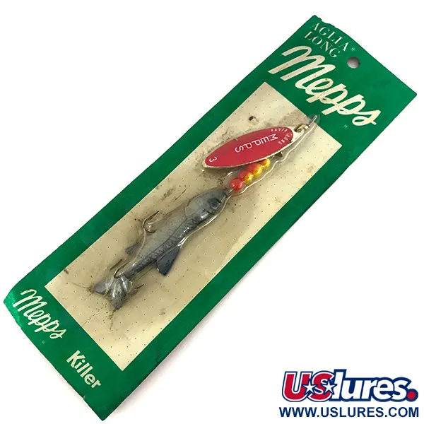Mit einer beachtlichen Länge von 13 cm (5") basiert das Profil dieses Vintage-Exemplars auf einem Gummifisch-Körper, der hinter der klassischen Spinner-Einheit für eine realistische Silhouette sorgt. Unter der Artikelnummer 7714 gelistet, beweist der Mepps Aglia Long 3 Mino die Vielseitigkeit der Marke bei der Kombination traditioneller Spinnerblatt-Mechanik mit Soft-Lure-Texturen. Ein Gewicht von 17 g (3/5 oz) erleichtert das Erreichen der Zieltiefe und sorgt für Stabilität beim Einholen. Das Aglia Long-Spinnerblatt in Größe 3 ist im Red Rainbo-Dekor gehalten – ein tiefrotes Finish, akzentuiert durch ein markantes weißes Logo. Der in den USA montierte Köder verfügt über eine Reihe abgestufter orangefarbener und gelber Perlen, die als Bisspunkt direkt über dem Gummifisch dienen. Dieser Köder ist unbenutzt und in seiner originalen grün-weißen Kartonverpackung erhalten, die auf der Rückseite noch einen Vintage-Rabattgutschein über 25 Cent zeigt.