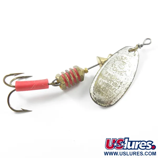 Dieser Spinner mit einem Gewicht von 6,5 g (1/4 oz) besticht durch Messingkomponenten und die für seine Ära charakteristischen roten Akzente. Dieser Mepps Comet 3 replaceable hook mit dem Produktcode 1843 hat eine Gesamtlänge von 7 cm (2 3/4"). Auf dem silbernen Blatt sind die Prägungen "Mepps Comet", "French Patent" und "Made in France" deutlich sichtbar, was auf die europäische Herkunft vor der Endmontage in den USA hinweist. Der Zustand der Metalloberflächen wird mit 4/5 bewertet und zeigt leichte, authentische Altersspuren, die den Charakter des Köders unterstreichen. Das Design umfasst ein hexagonales Messing-Gewichtssystem mit fünf markanten roten Ringen, das zu einem Drilling führt, der durch einen originalen roten Kunststoffschlauch geschützt ist. Die Drahtkonstruktion verfügt oben über eine stabile Öse für eine sichere Verbindung mit der Schnur, und der Mechanismus für den wechselbaren Haken bietet zusätzliche Flexibilität für verschiedene Angelbedingungen.