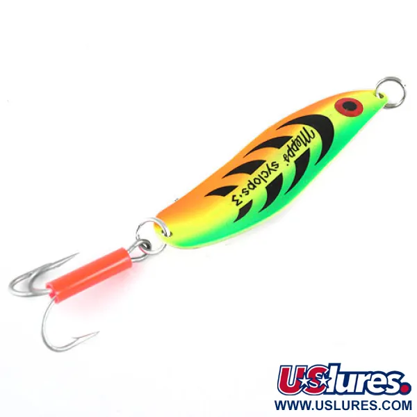 Ein lebhaftes Tiger-Muster prägt die Vorderseite dieses 9 cm (3 1/2") Blinkers, der in Schattierungen von Limettengrün über leuchtendes Gelb bis hin zu tiefem Orange übergeht. Der Mepps Syclops 3 mit dem Produktcode 0997 weist zehn markante schwarze sichelförmige Markierungen entlang seines S-förmigen Körpers auf, die ein kräftiges rotes Auge nahe der Spitze einrahmen. Die Rückseite aus poliertem Messing ist mit dem Herstellernamen und der französischen Herkunft geprägt. Mit einem Gewicht von 26 g (1 oz) ist die schwere Metallkonstruktion mit einem Drillingshaken am Sprengring kombiniert, der einen charakteristischen fluoreszierenden roten Schlauch am Schaft trägt. Dieses Exemplar befindet sich in Bestzustand (Bewertung 5/5), wobei die Lackierung und das Messingfinish außergewöhnlich sauber und glänzend erhalten sind.