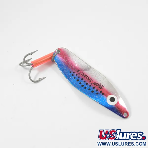Auf der Rückseite mit ihrer französischen Herkunft gestempelt, weist der 26g schwere Körper dieser Mepps Syclops 3 ein klassisches S-Profil für weite Würfe in tiefen Gewässerschichten auf. Das Rainbow Trout / Silver Farbschema auf der Außenseite geht von einer rosa Seitenlinie in eine blau gesprenkelte Oberseite über, alles vor einer reflektierenden silbernen Basis mit einem markanten Augendekal in der Nähe der Spitze. Mit einer Länge von 9 cm (3 1/2") verfügt der Blinker auf der konkaven Seite über deutliche Gravuren, die das Gewicht von 26g und den Modellnamen angeben. Ein robuster Drilling ist über einen hochbelastbaren Sprengring befestigt und verfügt über einen markanten rot-orangen Lockschlauch am Schenkel. Diese Ausführung mit der Artikelnummer 1947 befindet sich in einem Zustand von 5/5 und weist ein sauberes Finish auf den Metalloberflächen und der Originalhardware auf.