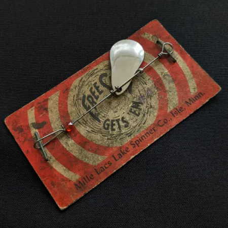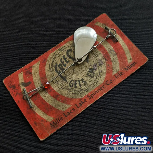 Die vernickelte Oberfläche des tropfenförmigen Spinnerblatts prägt das optische Profil dieses Mille Lacs Lake Spinners. Befestigt auf der originalen rot-goldenen Verkaufsverpackung, ist dieser Köder unbenutzt und befindet sich in dem Zustand, in dem er das Werk der Mille Lacs Lake Spinner Co. in Isle, Minnesota, verlassen hat. Eine einzelne facettierte rote Perle ist auf die Drahtachse aufgezogen, die eine Länge von 6 cm aufweist. Dieses spezielle Exemplar mit der Artikelnummer 20622 hat ein geringes Gewicht von 1 g. Die Konstruktion verfügt über einen einfachen Clevis für das Blatt sowie handgedrehte Drahtösen an beiden Enden und repräsentiert eine klassische Bauweise für in den USA gefertigtes Angelzubehör für Stillgewässer.