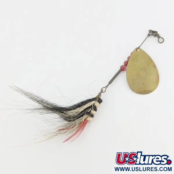 Poliertes Messing verleiht dem tropfenförmigen Spinnerblatt dieses Miller #3 MFG Springwater Spinners seinen klassischen Glanz. Mit einer Länge von 10 cm (4") und einem Gewicht von 7 g (1/4 oz) lässt sich der Köder präzise werfen. Drei lichtdurchlässige, rote, facettierte Perlen bilden einen optischen Kontrast zur Drahtachse und den Messingkomponenten. Dieser Spinner mit der Artikelnummer 24496 zeigt das handwerkliche Können der Miller Fishing Lure Co. seit 1929. Der Haken ist mit einer Kombination aus schwarzem und weißem Haar sowie einer leuchtend roten Feder am Ende gebunden. Der Zustand ist mit 4/5 sehr gut. Ein Metall-Abstandshalter trennt die Perlen von der Drahtöse und sorgt dafür, dass das Blatt frei rotieren kann.