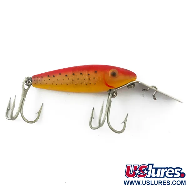 Mit einem Gewicht von filigranen 2,5 g (3/32 oz) zeigt dieses Modell der L&S Bait Company seine hochwertige Verarbeitung in der lebendigen Farbgebung Goldforelle. Dieses 4 cm (1 1/2") lange, sinkende Modell mit der Artikelnummer 4645 wurde ursprünglich für die Bejagung von Raubfischen wie Hecht und Zander in tieferen Wasserschichten entwickelt. Auf der Unterseite trägt die markante, rechteckige Metallschaufel die Prägung „L&S USA“, ein Markenzeichen der Produktionsgeschichte der Marke. Das Exemplar befindet sich im Zustand 4/5 und weist ein gut erhaltenes Finish auf, das seinen ursprünglichen Glanz sowie die feinen Details des aufgemalten Auges und des Punktmusters bewahrt hat. Die Ausstattung besteht aus zwei Vintage-Drillingen, die mit zeittypischen Schraubösen montiert sind.