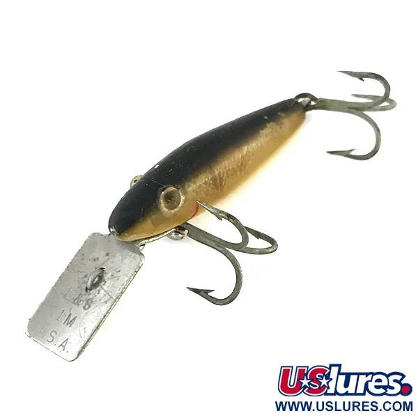 Dieser in den USA gefertigte, winzige sinkende Köder wiegt leichte 3/32 oz (2,5 g). Dieses spezielle MirrOlure-Modell mit der Artikelnummer 8501 misst kompakte 1 1/2" (4 cm) und besticht durch ein klassisches Gold-Finish mit dunklem Rücken und dezenten roten Akzenten im Kiemenbereich. Die Ausstattung umfasst zwei original Drillingshaken, die über eine Bauchschraube und eine hintere Öse befestigt sind. Ein markantes Merkmal dieser Konstruktion ist die rechteckige Tauchschaufel aus Metall, die mit den Prägungen des Herstellers versehen ist. Der Korpus zeigt sein Alter durch eine leichte Mattierung des Lacks, was ihm eine Zustandsbewertung von 5/5 einbringt. Von der L&S Bait Company für sinkende Anwendungen entwickelt, suchen Sammler oft nach diesen kleineren Varianten, die für Arten wie Hecht oder Zander gedacht sind. Die aufgemalten Augen heben sich deutlich von den goldfarbenen Flanken ab.