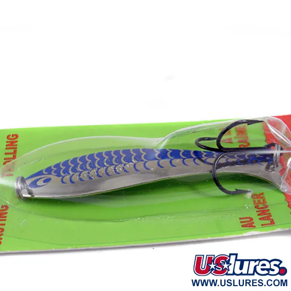 Ein poliertes Nickel-Finish bildet die Basis für das tiefblaue Schuppenmuster dieses in Kanada hergestellten Köders mit dem Produktcode 0725. Hergestellt von Williams, bleibt der Mooselook wobbler eine erstklassige Wahl für gezieltes Angeln auf Seeforellen und Binnenlachse beim Spinnfischen oder Schleppen. Der 9,5 cm (3 3/4") lange Körper bewahrt das ursprüngliche Aussehen eines unbenutzten Sammlerstücks, originalverpackt in der markanten grün-roten Blisterpackung von J.A. Greene Inc. Mit einem Gewicht von 10 g (1/3 oz) spiegelt die Verarbeitung des Blinkers die hohen Qualitätsstandards nordamerikanischer Metallarbeiten wider. Zur Ausstattung gehört ein robuster Drilling, der über einen Sprengring am Heck montiert ist, während die Signatur der Marke deutlich auf der Rückseite des Metalls eingeprägt ist.