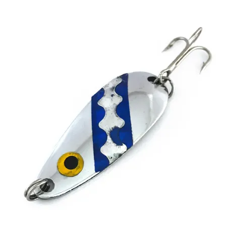 Auf der Rückseite ist das Markenzeichen „Moriyama JAPAN“ deutlich eingeprägt, was von der Handwerkskunst dieses 1/4oz (7g) Blinkers zeugt. Die Vorderseite des Köders besticht durch ein hochglanzpoliertes Nickel-Finish, das von einem leuchtend blauen Vertikalband unterbrochen wird, in dem sich ein einzigartiges, gewelltes silbernes Schuppenmuster befindet. In der Nähe der Vorderkante sitzt ein markantes gelbes Auge mit tiefer schwarzer Pupille, was dem 1 1/2" (4cm) langen Körper visuelle Tiefe verleiht. Dieses Exemplar mit der Artikelnummer 8088 verfügt über die Original-Hardware, einschließlich eines sauberen Drillingshakens und Sprengringen. Mit einer Zustandsbewertung von 5/5 sind die reflektierenden Oberflächen und lackierten Details hervorragend erhalten, was die Langlebigkeit der klassischen japanischen Fertigung unterstreicht. Die solide Materialstärke und das Tropfenprofil machen ihn zu einer verlässlichen Wahl für weite Würfe oder konstantes Schleppfischen.