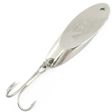 Die Vernickelung verleiht diesem 21g (3/4oz) schweren Metallköder ein klassisches, reflektierendes Finish. Hergestellt von Weber, einem amerikanischen Hersteller mit einer jahrhundertelangen Tradition in der Angelgeräteindustrie, wurde das Modell Mr Champ später von Luhr Jensen übernommen. Der Körper misst 6cm (2 1/4") und trägt den direkt in das Metall gestempelten Namen „MR CHAMP“. Dieses Exemplar mit der Artikelnummer 6932 befindet sich in einem erstklassigen Zustand (Bewertung 5/5). Zur Montage verfügt er über ein sauberes Öhr am verjüngten Kopf und einen Drillingshaken, der durch einen Sprengring am Schwanz gesichert ist.