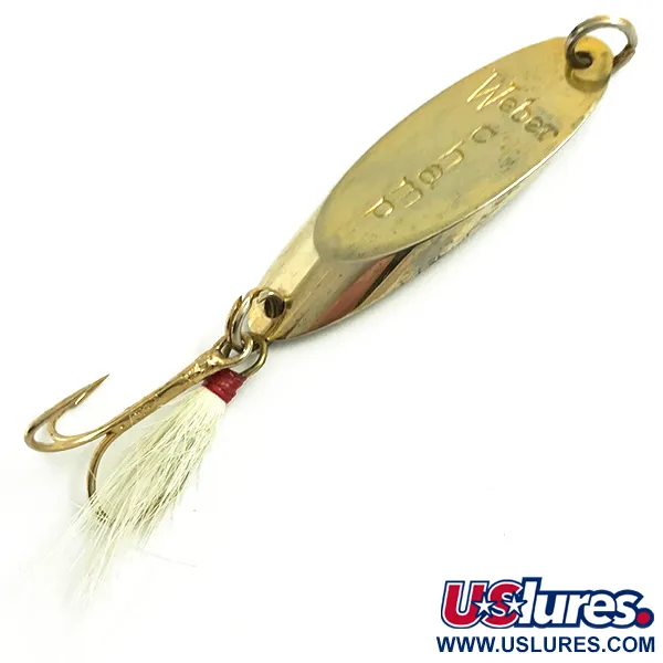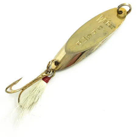 Der Weber Name ist deutlich auf dem polierten 14g (1/2oz) Metallkörper eingestanzt und kennzeichnet diesen MrChamp als einen Teil des amerikanischen Tackle-Erbes eines Unternehmens mit einer hundertjährigen Geschichte in den USA und Kanada. Dieses 5 cm (2") große goldene Exemplar mit dem Produktcode 6068 repräsentiert das Design, bevor die Marke später in das Sortiment von Luhr Jensen integriert wurde. Der Zustand ist bemerkenswert sauber, mit einer Bewertung von 5/5 für den erhaltenen Glanz der Oberfläche. Am hinteren Ende befindet sich ein gefiederter Drilling mit einem Bündel weißer Haare, die durch eine traditionelle rote Garnwicklung gesichert sind. Ein stabiler Sprengring an der Spitze bietet einen soliden Verbindungspunkt für Wurf- oder Jig-Montagen.