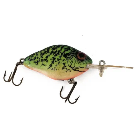 Mit einer Länge von 5 cm (2") repräsentiert dieses Exemplar die Entwicklung der Marke Lazy Ike in der Mitte des Jahrhunderts vom handgefertigten Holz zum robusten Kunststoff. Das Dekor dieses 8 g (1/4 oz) schweren Crankbaits zeigt ein detailliertes Crappie-Muster auf einer kräftigen grünen Basis, überzogen mit einer markanten schwarzen Marmorierung und einem hellen, cremefarbenen Bauch. Sein großes, dunkles Auge ist ein charakteristisches Designmerkmal der Natural Ike Serie, das die anatomischen Merkmale eines echten Beutefisches nachahmen soll. Ursprünglich von der Kautzky Manufacturing Company hergestellt – einer 1897 von einem österreichischen Einwanderer gegründeten Firma, die schließlich Teil der Pradco-Gruppe wurde – trägt dieses Modell den Produktcode 14779. Die transparente Tauchschaufel aus Kunststoff ist mit dem Modellnamen geprägt, und obwohl sie einen kleinen Riss aufweist, bleibt der Köder ein bedeutendes Stück amerikanischer Angelgeschichte. Zwei Standard-Drillinge sind an Ösen an Bauch und Schwanz montiert. Dieses Exemplar befindet sich in einem Zustand von 4/5 und weist trotz der leichten Materialbeanspruchung an der Tauchschaufel eine gut erhaltene Lackierung auf.