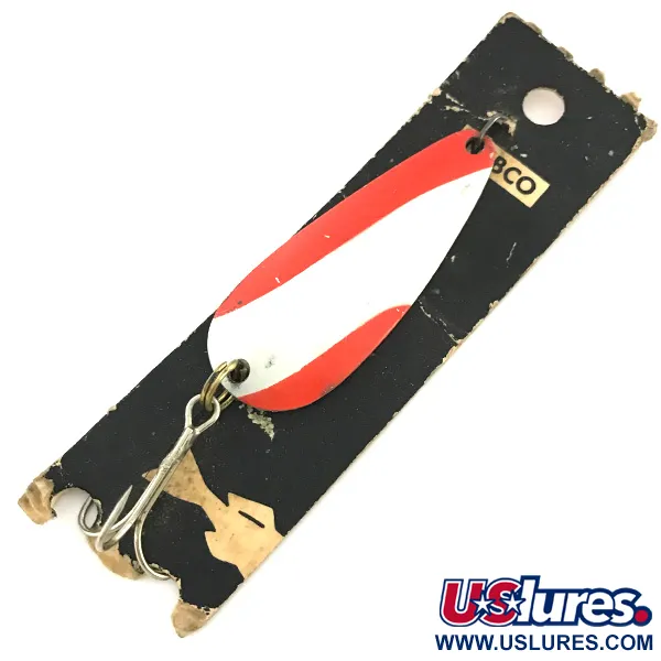 Mit einem Gewicht von 10g (1/3oz) bietet der Nebco FlashBait 266 ein beachtliches Wurfgewicht für seine Größe von 5,5cm (2 1/4"). Dieses Exemplar mit dem Produktcode 6801 ist unbenutzt und befindet sich auf der originalen schwarz-goldenen Verpackungskarte. Die Vorderseite des Blinkers ist im klassischen rot-weißen Diagonalmuster lackiert, während die Rückseite ein poliertes Nickel-Finish aufweist. Da er in den USA hergestellt wurde, verfügt er über einen robusten Sprengring zur Befestigung eines großen Einzelhakens – eine Konfiguration, die beim Werfen oder Schleppen Hänger minimiert. Der Name „NEBCO“ ist deutlich auf dem Goldfolienaufkleber der Karte zu erkennen, was die amerikanische Herkunft unterstreicht. Die Lackierung ist kräftig, die weißen und roten Streifen setzen sich scharf vom Metallgrund ab. Jedes Detail, von der schlichten Hardware bis zur Lochkarte für den Verkauf, spiegelt eine vergangene Ära funktionalen Angelzubehörs wider.