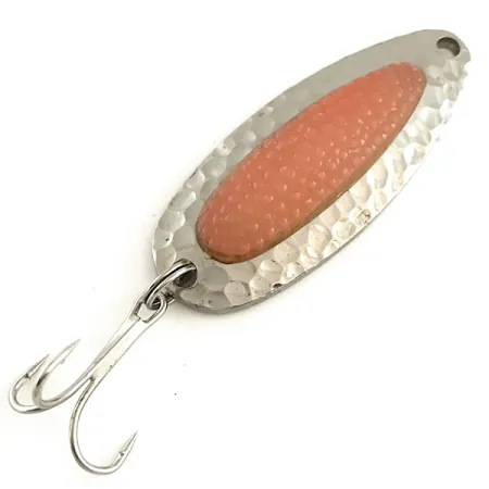 Ein schwerer Messingkörper mit einem Gewicht von 1/2 oz (14 g) ermöglicht es diesem Nebco Blinker, wie ein Projektil zu fliegen und tiefe Gumpen in schnell fließenden Flüssen zu erreichen. Der 2 1/4" (5.5 cm) lange Rahmen ist mit gehämmertem Nickel beschichtet, was eine strukturierte Oberfläche bietet, die selbst in trübem Wasser starke Lichtreflexe erzeugt. Im Zentrum befindet sich ein Lachsei-Imitat in einem Braunton, ein spezielles visuelles Element, das Salmoniden und andere Raubfische zum Anbiss reizt. Mit dem Produktcode 6462 weist der Köder einen 5/5-Zustand auf und zeigt ein sauberes, hochwertiges Finish sowohl auf dem Metall als auch auf dem Kunststoffeinsatz. Er ist mit einem scharfen Drilling und einem robusten Sprengring ausgestattet, was Langlebigkeit bei intensivem Einsatz im Süß- oder Salzwasser garantiert. Ob beim Schleppangeln in Seen oder beim Auswerfen in der Brandung, das Design ermöglicht dartende, taumelnde und rollende Bewegungen, die ihn zu einem Standard in vielen Angelkisten gemacht haben. Eine einzelne Öse am Kopf sorgt für eine sichere Verbindung mit einem Wirbel, um die Köderpräsentation zu optimieren.