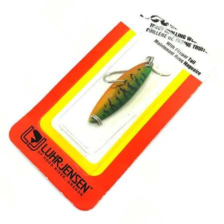 Dekors wie 'Metallic Perch' (Artikelnummer 1051-001-0814) zeigen die klassische Detailverliebtheit von Luhr Jensen, mit markanten vertikalen Streifen auf einem leuchtenden Farbverlauf von Grün nach Orange. Dieser 3,5 cm lange Löffelblinker ist ein spezialisierter Schleppköder, der mit seinem Gewicht von 2 g genau darauf ausgelegt ist, seine Tiefe in der Wassersäule zu halten, ohne zu schnell abzusinken. Am Ende des schlanken Körpers sorgt ein markantes Lockplättchen aus Metall für zusätzliche Lichtreflexe, während der Einzelhaken bereits ab Werk montiert ist. Der Köder befindet sich in der Original-Blisterverpackung und ist unbenutzt. Er wurde primär für Forellen und Lachse entwickelt und ist ideal für das langsame Schleppfischen in Seen und Teichen, wo sein schlankes Profil kleine Futterfische imitiert. Während Luhr Jensen für seine Wurzeln in Hood River, Oregon, legendär ist, wurde dieses Exemplar unter der Regie der Rapala VMC Corp. in Indonesien gefertigt.